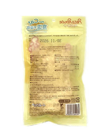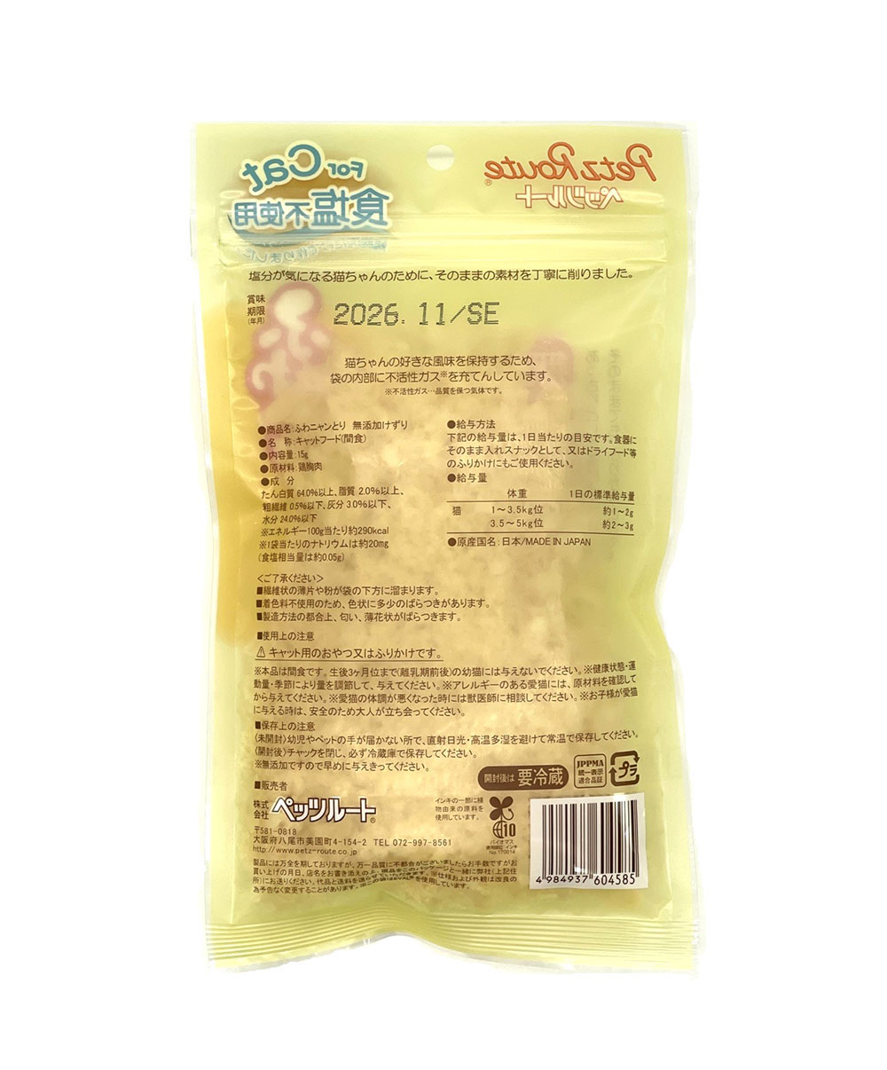 ※繊維状の薄片や粉が下の方に溜まります。※着色料不使用のため、色状に多少のばらつきがあります。※製造方法の都合上、匂い、薄花状がばらつきます。【使用上の注意】キャット用のおやつ又はふりかけです。※本品は間食です。生後3ヶ月位まで(離乳期前後)の幼猫には与えないでください。※お子様がに与える時は、安全のため大人が立ち会ってください。※給与量を参考に、愛猫が食べ過ぎないようにしてください。※アレルギーのある愛猫には、原材料を確認してから与えてください。※愛猫の体調が悪くなった時には獣医師に相談してください。【保存上の注意】〈未開封〉幼児やペットの手が届かない所で、直射日光、高温多湿を避けて保存してください。〈開封後〉チャックを閉じ、必ず冷蔵庫で保存してください。※無添加ですので早めに与えきってください。 |