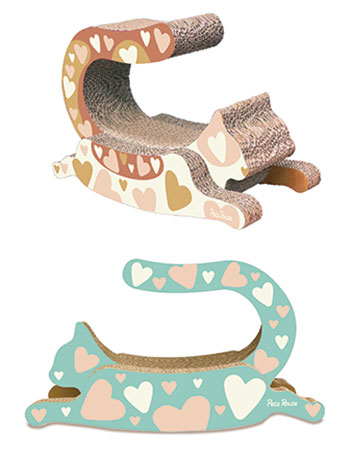 手足を伸ばしたシルエットでゆらゆら優しくスイングしハートフルな優しいリバーシブルカラーを組み合わせたデザイン。背中とシッポでゆったりリラックスしてくつろげるスペース。裏側を使うと三毛にゃんカラーに変身。立体感のあるシッポは十分な幅を持たせ思う存分爪とぎできる形状。爪とぎは背中とシッポで上は見晴らし台にもなります。