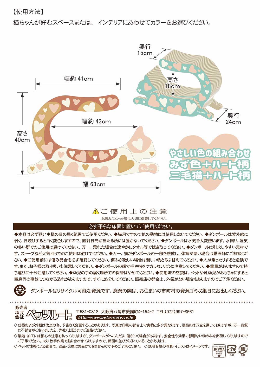 【使用上の注意】●本品は猫用ですので他のペットにはご使用しないでください。●爪みがき以外の用途ではご使用しないでください。●本品の切り口等で手や指を傷付けないよう注意してください。●本品は必ず人が見ている所でご使用してください。●直射日光・高温多湿の場所は変形・変色・カビ発生の原因となりますので避けてご使用してください。●火災・変形の恐れがありますので、火気のそばではご使用しないでください。●猫が本品の一部を誤飲した場合は獣医師にご相談ください。●ご使用前には傷み具合を必ず確認してください。傷みが激しい場合はご使用しないでください。●上に物をのせたり人が乗ったりしないでください。小さいお子様がいらっしゃる場合は目の届く場所でご使用ください。●重量がありますので持ち運びに十分注意してください。