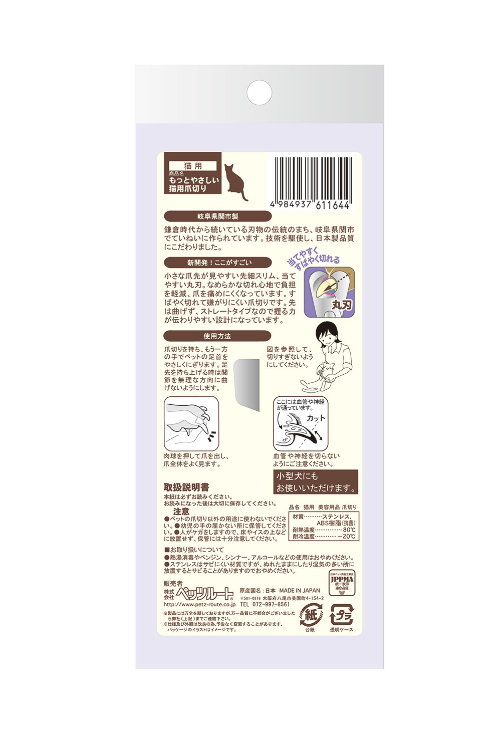 小さな爪先が見やすい先細スリム、当てやすい丸刃。スッ!となめらかな切れ心地で負担を軽減、爪を痛めにくくなっています。魔法のハンドルで指にフィット、すばやく切れて嫌がりにくい爪切りです。刃先は曲げず、ストレートタイプなので握る力が伝わりやすい設計になっています。小型犬にもお使いいただけます。刃物の伝統の町岐阜県関市製。