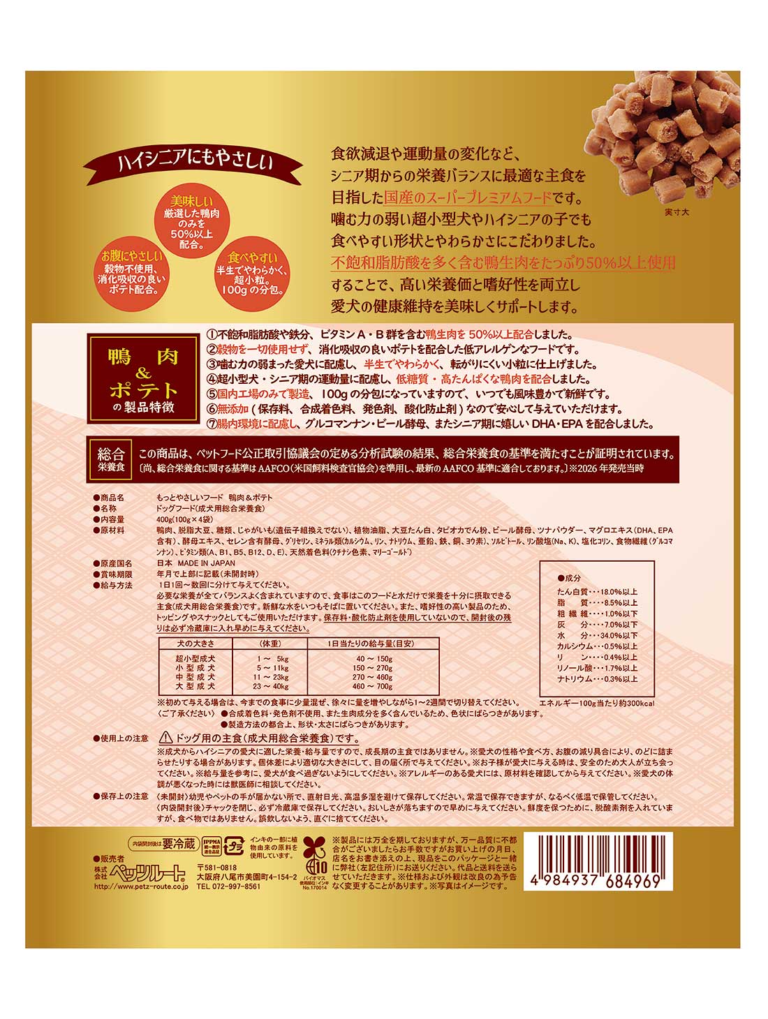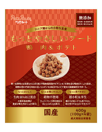 厳選した鴨肉のみを50%以上配合。噛む力の弱い子やハイシニアの子でも食べやすいように超小粒の半生タイプに仕上げた国産スーパープレミアムフードです。 |