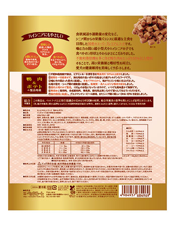 鴨肉、脱脂大豆、糖類、じゃがいも(遺伝子組換えでない)、植物油脂、大豆たん白、タピオカでん粉、ビール酵母、ツナパウダー、マグロエキス(DHA、EPA含有)、酵母エキス、セレン含有酵母、グリセリン、ミネラル類(カルシウム、リン、ナトリウム、亜鉛、鉄、銅、ヨウ素)、ソルビトール、リン酸塩(Na、K)、塩化コリン、食物繊維(グルコマンナン)、ビタミン類(A、B1、B5、B12、D、E)、天然着色料(クチナシ色素、マリーゴールド) |