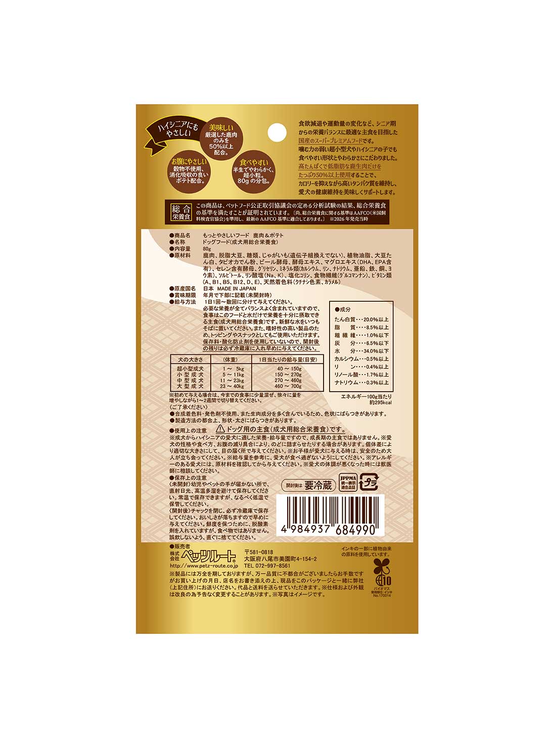 1日1回〜数回に分けて与えてください。必要な栄養が全てバランスよく含まれていますので、食事はこのフードと水だけで栄養を十分に摂取できる主食(成犬用総合栄養食)です。新鮮な水をいつもそばに置いてください。また、嗜好性が高い製品のため、トッピングやスナックとしてもご使用いただけます。保存料・酸化防止剤を使用していないので、開封後の残りは必ず冷蔵庫に入れて早めに与えてください。 |
