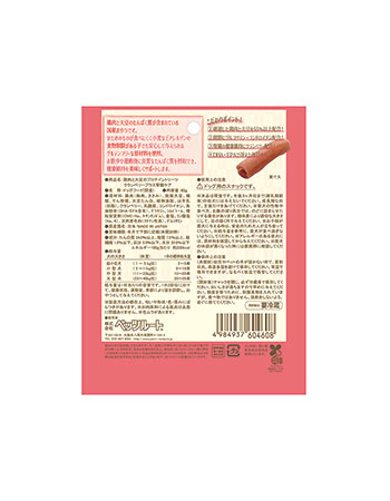 鶏肉(胸肉、ささみ)、脱脂大豆、糖類、でん粉類、大豆たん白、植物油脂、山羊乳(脱脂)、クランベリー、乳酸菌、コンドロイチン、魚油粉末(DHA・EPA含有)、グリセリン、ソルビトール、増粘安定剤(CMC-Na、キサンタンガム)、食塩、リン酸塩(Na、K)、天然着色料(クチナシ色素)、グルコサミン