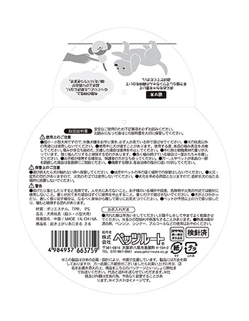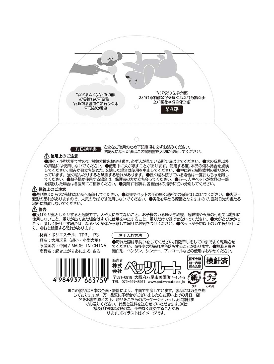 布製の特性上、ゆっくりとした動きになり、起き上がり具合が傾いたりバラつきます。 ※重りが入っています。危険ですので、投げたり叩いたりしないでください。重りが出てきた場合は使用を中止してください。※鈴が入っています。遊び方や力によって破損や鈴が出てくることがあります。本品が傷みはじめたら使用を中止してください。【使用上の注意】●超小型・小型犬用ですので、対象犬種をお守り頂き、必ず人が見ている所で遊ばせてください。●使用中に犬が壊すことがあります。使用する度、本品の傷み具合を点検してください。傷みが目立ち始めた、又壊した場合は使用を中止してください。●強く噛んだりすると破損する恐れがあります。●長く噛み続けている場合は一度おもちゃを離してください。●お子様が使用する場合は、保護者の方が立ち会ってください。●万一、人やペットが本品の一部を誤飲した場合は各医師にご相談ください。●廃棄する際は、各自治体の指示に従い分別してください。【保管上の注意】●遊び終えたら犬が触れない所へ保管してください。●幼児やペットの手の届く場所での保管はしないでください。●火災・変形の恐れがありますので、火気のそばでは使用しないでください。●劣化を早める原因となりますので、直射日光の当たる場所に放置しないでください。【お手入れ方法】●汚れた際は手洗いをしてください。日陰干しをして中までよく乾燥させてください。※多少の型崩れや色落ちすることがあります。●熱湯消毒や漂白剤、ベンジン、シンナー、アルコールなどの使用はおやめください。