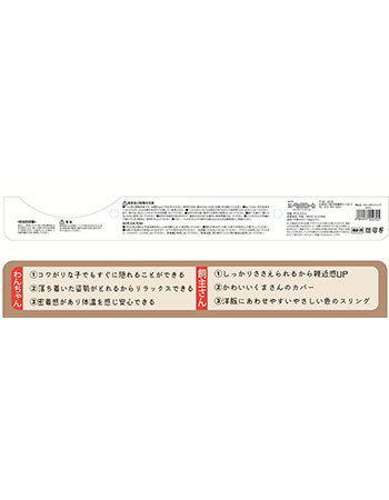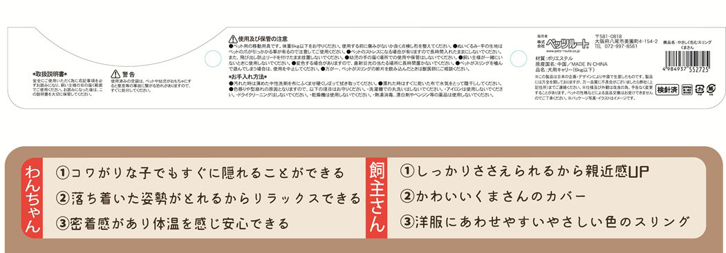 【使用上の注意】●ペット用のスリング以外の用途には使用しないでください。●体重6kgまでご使用できます。●ぬいぐるみ・手の生地はペットの爪が引っかかりやすいです。注意してご使用ください。●ご使用前に形を整えてからお使いください。●幼児の手の届く場所での使用や保管はしないでください。●お子様が遊具などに使用しないようにご注意ください。●火災・変形の恐れがありますので、火気のそばで使用しないでください。●変色する場合がありますので、直射日光の当たる場所に長時間置かないでください。●ペットがスリングを噛んで遊んでしまう場合は、使用を中止してください。●万が一、ペットがスリングの断片を飲み込んだときは獣医師にご相談ください。
