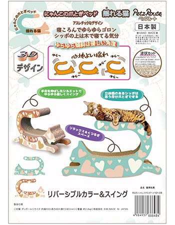 手足を伸ばしたシルエットでゆらゆら優しくスイングしハートフルな優しいリバーシブルカラーを組み合わせたデザイン。背中とシッポでゆったりリラックスしてくつろげるスペース。裏側を使うと三毛にゃんカラーに変身。立体感のあるシッポは十分な幅を持たせ思う存分爪とぎできる形状。爪とぎは背中とシッポで上は見晴らし台にもなります。