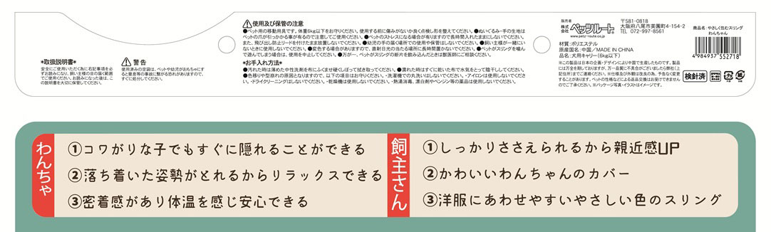 【使用上の注意】●ペット用のスリング以外の用途には使用しないでください。●体重6kgまでご使用できます。●ぬいぐるみ・手の生地はペットの爪が引っかかりやすいです。注意してご使用ください。●ご使用前に形を整えてからお使いください。●幼児の手の届く場所での使用や保管はしないでください。●お子様が遊具などに使用しないようにご注意ください。●火災・変形の恐れがありますので、火気のそばで使用しないでください。●変色する場合がありますので、直射日光の当たる場所に長時間置かないでください。●ペットがスリングを噛んで遊んでしまう場合は、使用を中止してください。●万が一、ペットがスリングの断片を飲み込んだときは獣医師にご相談ください。