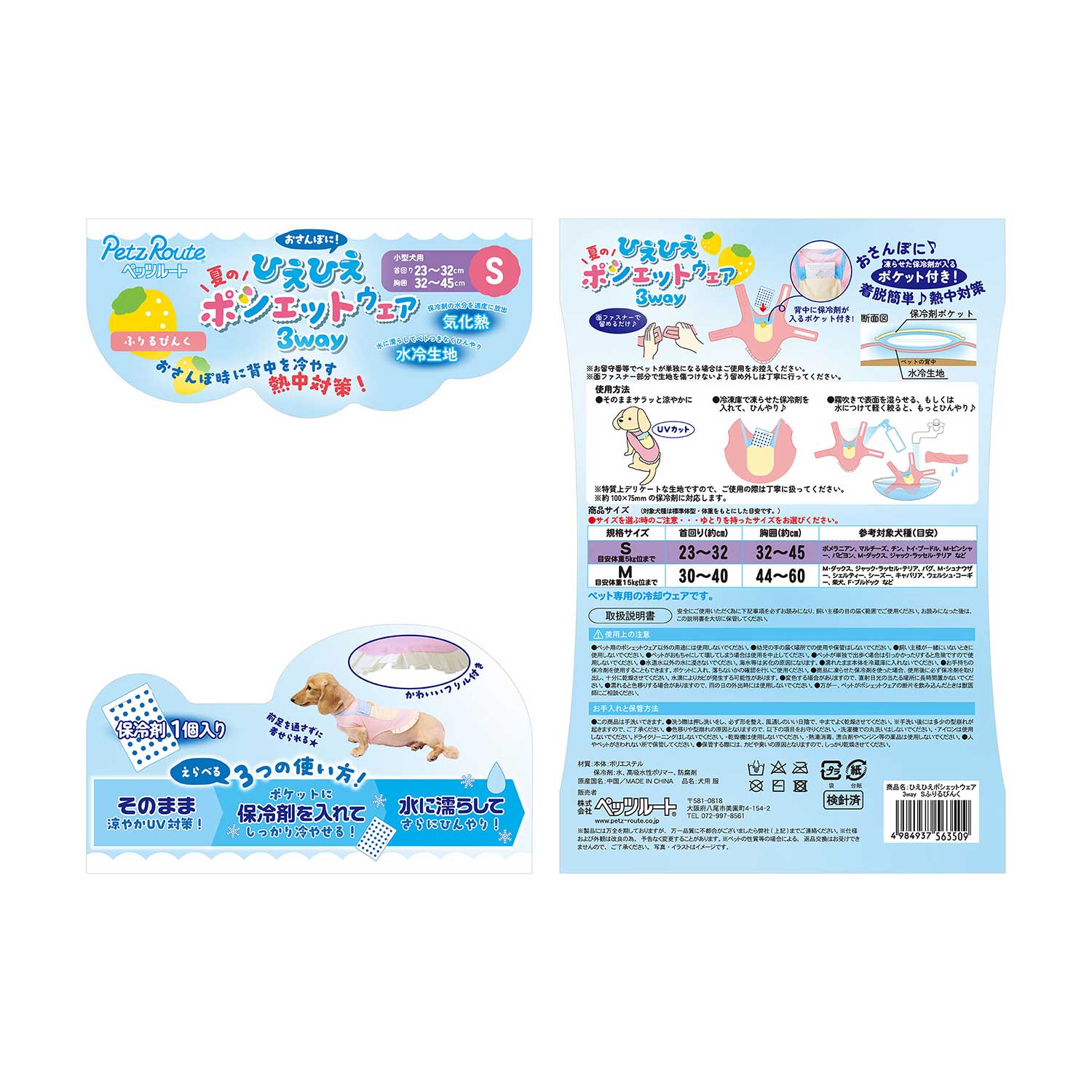 暑さに合わせて3wayできるポシェットウェア。おさんぽ時に背中全体を冷やして熱中症対策ができます。背中のポシェットに保冷剤を入れて気化熱でひんやり。水冷生地を使用しているので水に濡らすとベトつきなくもっとひんやりします。柔らかい面ファスナーで前足を通さず着せられます。かわいいフリル付き!