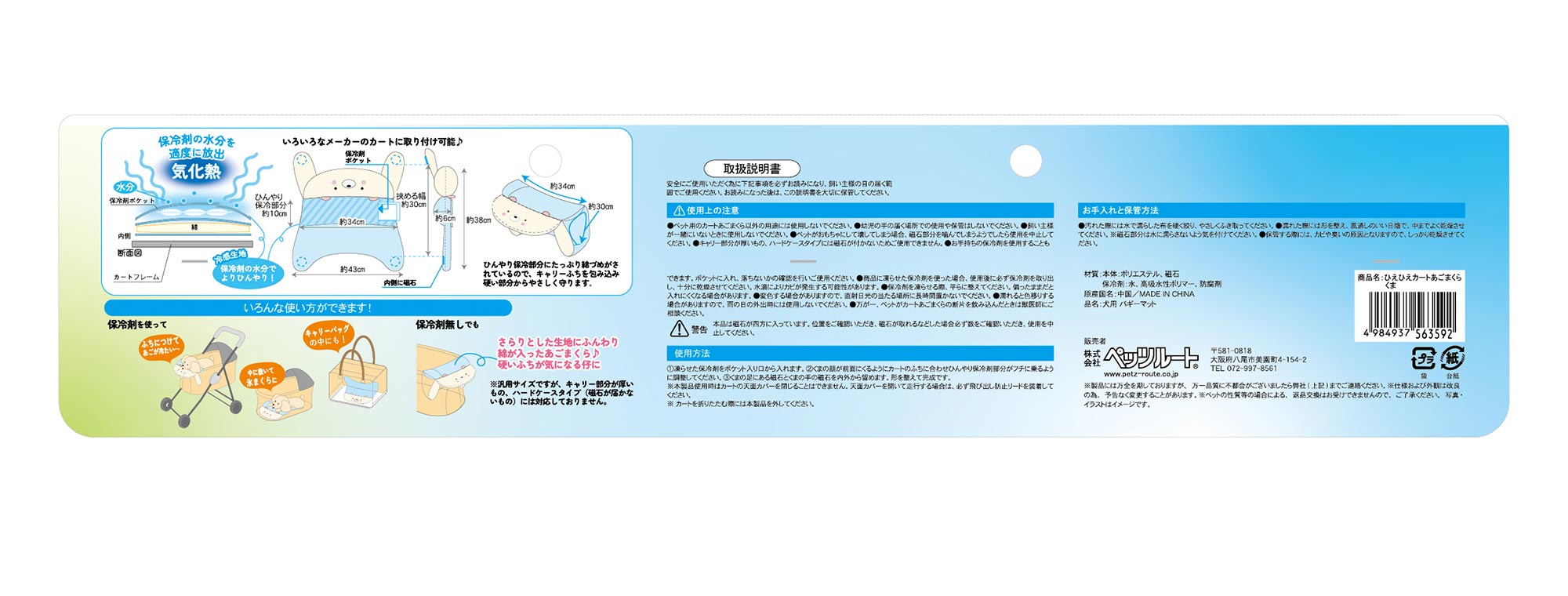 @凍らせた保冷剤をポケット入り口から入れます。Aくまの顔が前面にくるようにカートのふちに合わせひんやり保冷剤部分がフチに乗るように調整してください。Bくまの足にある磁石とくまの手の磁石を内外から留めます。形を整えて完成です。※本製品使用時はカートの天面カバーを閉じることはできません。天面カバーを開いて走行する場合は、必ず飛び出し防止リードを装着してください。※ カートを折りたたむ際には本製品を外してください。【お手入れ方法】●汚れた際には水で濡らした布を硬く絞り、やさしくふき取ってください。●濡れた際には形を整え、風通しのいい日陰で、中までよく乾燥させてください。※磁石部分は水に濡らさないよう気を付けてください。●保管する際には、カビや臭いの原因となりますので、しっかり乾燥させてください。